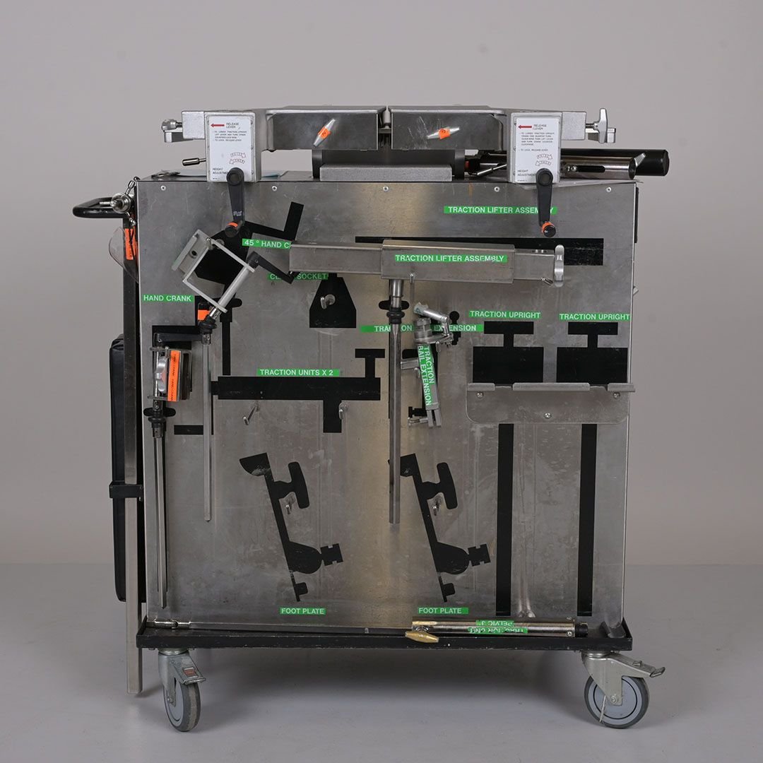 The Jackson fracture table traction attachment kit is a complete used orthopedic accessory set available from GlobalMedBrokers. This kit supports traction positioning during spinal, hip, and femoral fracture surgeries performed on the Jackson table platform. It ships via freight from Columbus, Ohio, and suits orthopedic surgery departments and equipment resellers.